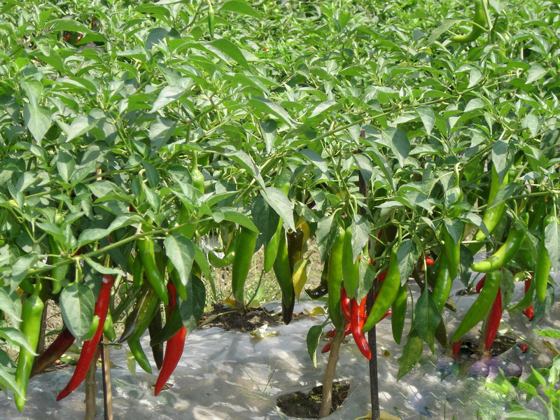 第三,精細(xì)配方施肥。辣椒喜肥又怕肥,對(duì)肥料十分敏感。要做到有機(jī)肥與無(wú)機(jī)肥配合施用,有機(jī)肥一定要充分腐熟;因土因苗酌情施用氮肥,特別是不能過(guò)量施用尿素;配施磷、鉀和微量元素肥,防止“失綠”癥狀發(fā)生;避過(guò)高溫,用腐熟的低濃度清水糞追肥;預(yù)防脫肥,確保全程營(yíng)養(yǎng)充足,防止“缺綠”落黃。在具體操作上,每畝基肥可施用腐熟的土雜肥5000公斤或禽畜廄肥4000公斤,配施磷肥30~40公斤,硫酸鉀20公斤左右,既可撒施后翻耕耙勻,又可開(kāi)溝條施。追肥一般三次,一是提苗肥,移栽幼苗成活后,每畝可追腐熟的清水糞500~800公斤,出現(xiàn)兩層果枝后,再追腐熟的人糞尿1000~1500公斤。辣椒的生育期較長(zhǎng),采果2~3批后,還可視苗情每畝追尿素10公斤左右。